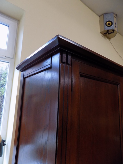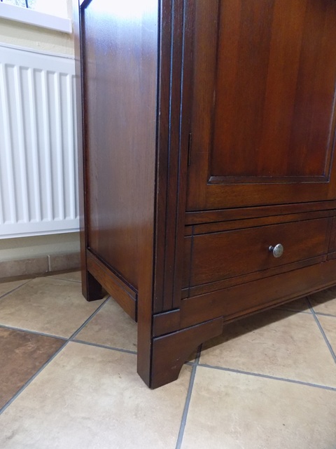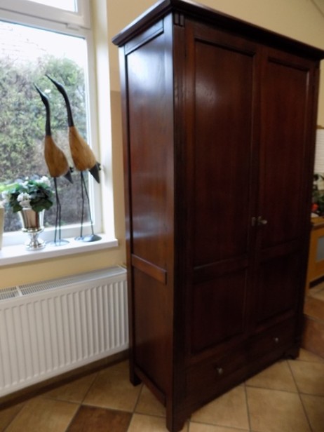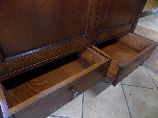 Skriňa z masívneho dreva, v spodnej časti dve zásuvky.